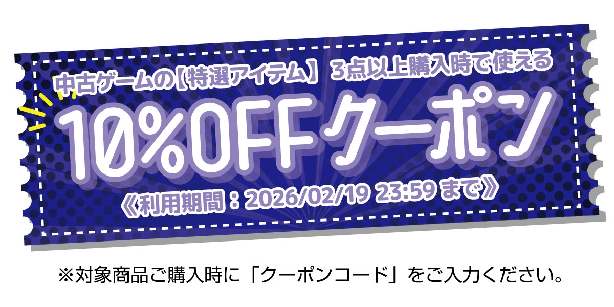 ※本クーポンは商品名に【特選アイテム】と表示のある中古ゲームを3点以上ご購入の際にご利用いただけます。