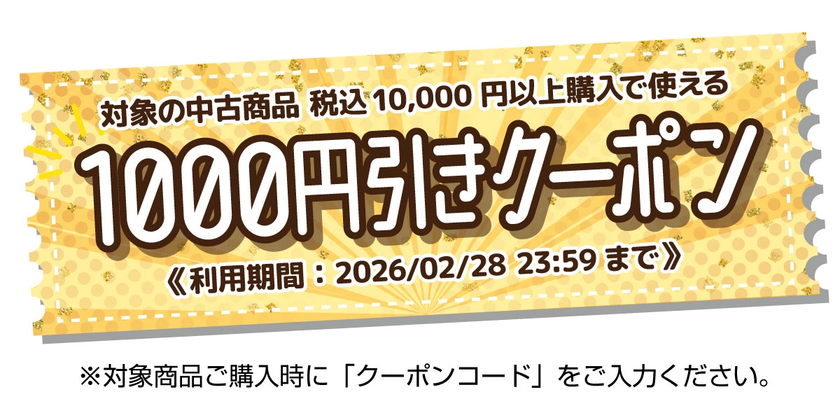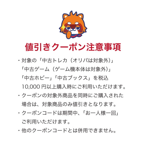 ※対象の中古トレカ(オリジナルパックは対象外)・中古ゲーム(ゲーム機本体は対象外)・中古ホビー・中古ブックスを税込10,000円以上ご購入の際にご利用いただけます。