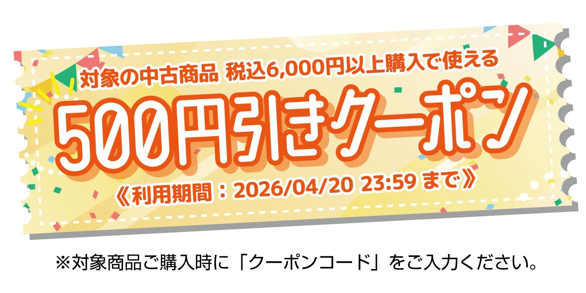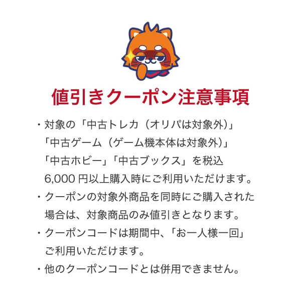 ※対象の中古トレカ(オリジナルパックは対象外)・中古ゲーム(ゲーム機本体は対象外)・中古ホビー・中古ブックスを税込6,000円以上ご購入の際にご利用いただけます。