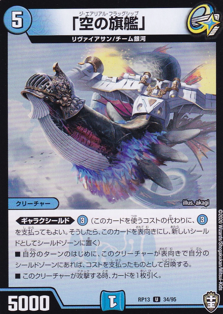 ■EXライフ(このクリーチャーを出す時、自分の山札の上から1枚目をシールド化する。このクリーチャーが離れる時、かわりにそのシールドを墓地に置く)■ ブロッカー(このクリーチャーをタップして、相手クリーチャーの攻撃先をこのクリーチャーに変更してもよい)■W・ブレイカー(このクリーチャーはシールドを2つブレイクする)■このクリーチャーはタップして出て、自分のターンのはじめにアンタップしない。■自分が呪文を唱えた時、このクリーチャーをアンタップする。