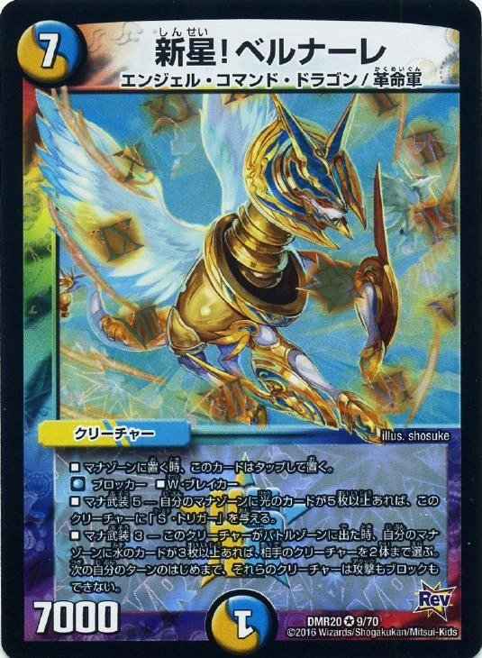 ■マナゾーンに置く時、このカードはタップして置く。■ブロッカー■W・ブレイカー■マナ武装5-自分のマナゾーンに光のカードが5枚以上あれば、このクリーチャーに「S・トリガー」を与える。■マナ武装3-このクリーチャーがバトルゾーンに出た時、自分のマナゾーンに水のカードが3枚以上あれば、相手のクリーチャーを2体まで選ぶ。次の自分のターンのはじめまで、それらのクリーチャーは攻撃もブロックもできない。