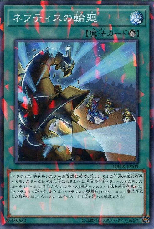 「ネフティス」儀式モンスターの降臨に必要。①:レベルの合計が儀式召喚するモンスターのレベル以上になるように、自分の手札・フィールドのモンスターをリリースし、手札から「ネフティス」儀式モンスター1体を儀式召喚する。「ネフティスの祀り手」または「ネフティスの蒼凰神」をリリースして儀式召喚した場合には、さらにフィールドのカード1枚を選んで破壊できる。