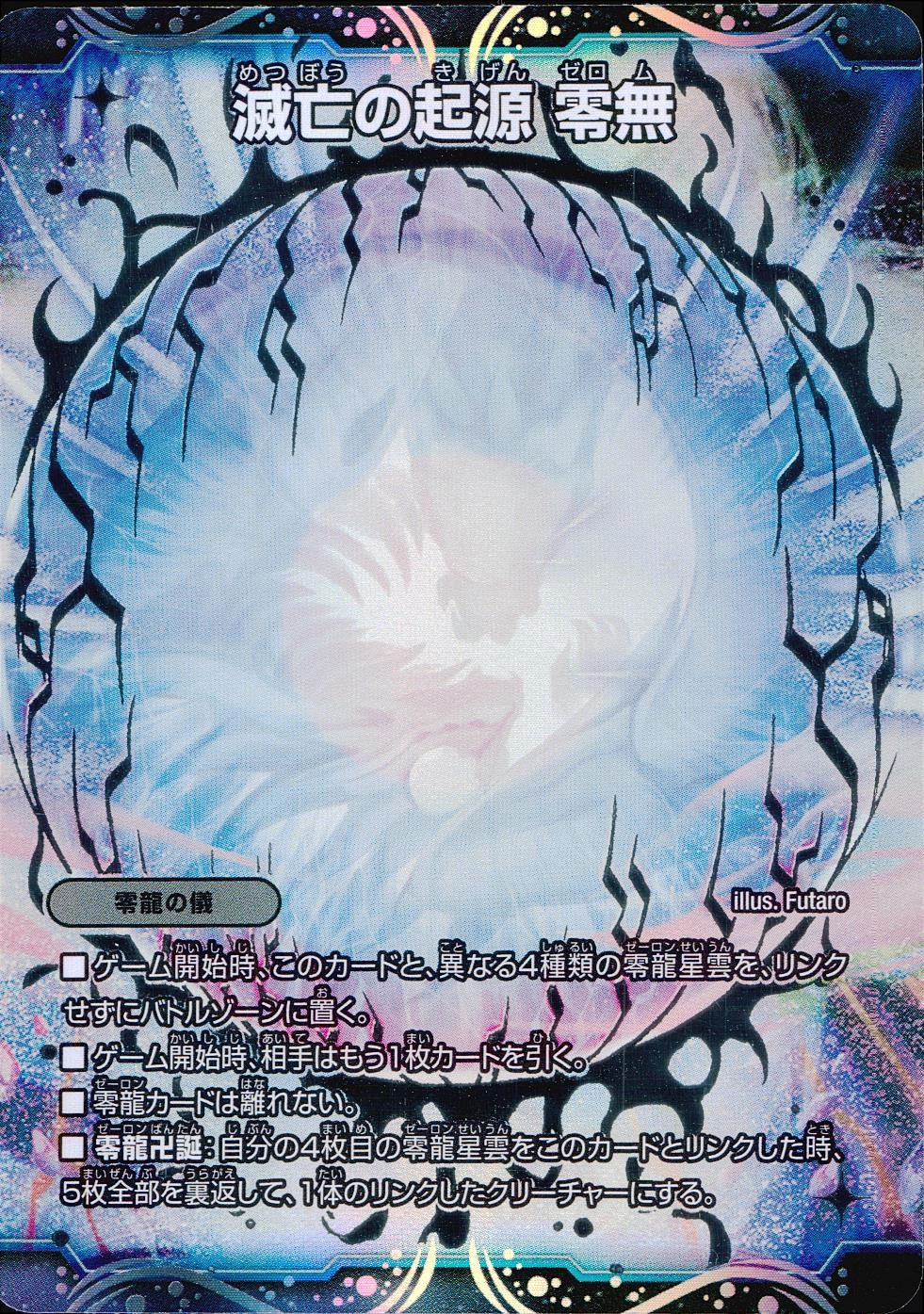 【零龍の儀】■ゲーム開始時、このカードと、異なる4種類の零龍星雲を、リンクせずにバトルゾーンに置く。■ゲーム開始時、相手はもう1枚カードを引く。■零龍カードは離れない。■零龍卍誕:自分の4枚目の零龍星雲をこのカードとリンクした時、5枚全部を裏返して、1体のリンクしたクリーチャーにする。