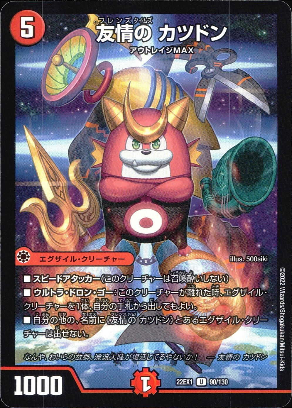 ■スピードアタッカー(このクリーチャーは召喚酔いしない)■ウルトラ・ドロン・ゴー:このクリーチャーが離れた時、エグザイル・クリーチャーを1体、自分の手札から出してもよい。■自分の他の、名前に《友情の カツドン》とあるエグザイル・クリーチャーは出せない。