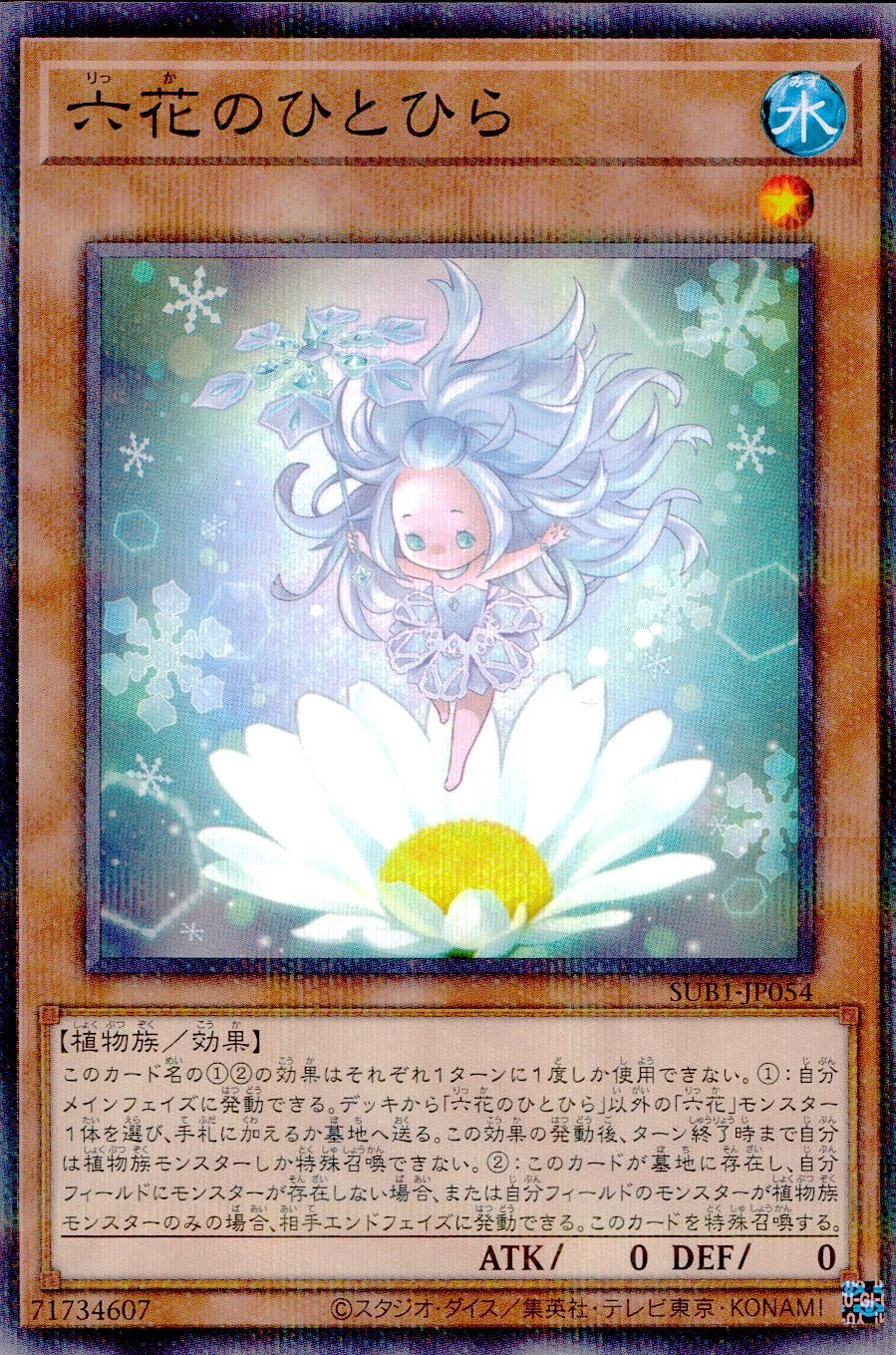 このカード名の①②の効果はそれぞれ1ターンに1度しか使用できない。①:自分メインフェイズに発動できる。デッキから「六花のひとひら」以外の「六花」モンスター1体を選び、手札に加えるか墓地へ送る。この効果の発動後、ターン終了時まで自分は植物族モンスターしか特殊召喚できない。②:このカードが墓地に存在し、自分フィールドにモンスターが存在しない場合、または自分フィールドのモンスターが植物族モンスターのみの場合、相手エンドフェイズに発動できる。このカードを特殊召喚する。