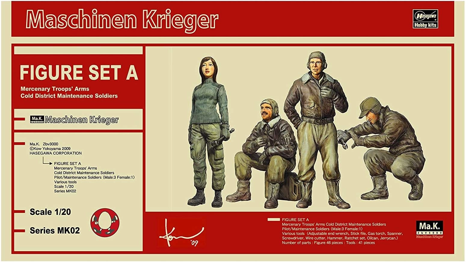 横山宏氏のスケッチを元にした、傭兵軍パイロット/整備兵(男性3体・女性1体)のフィギュア4体セットです。1/20スケールのMa.K.世界が広がります! 各種工具などのアクセサリーも付属。(スパナ・ドライバー・ワイヤーカッター・油差し・ハンマー・ラチェットセット・モンキーレンチ・金ヤスリ・工具箱・バーナー・オイル缶・ジェリ缶)