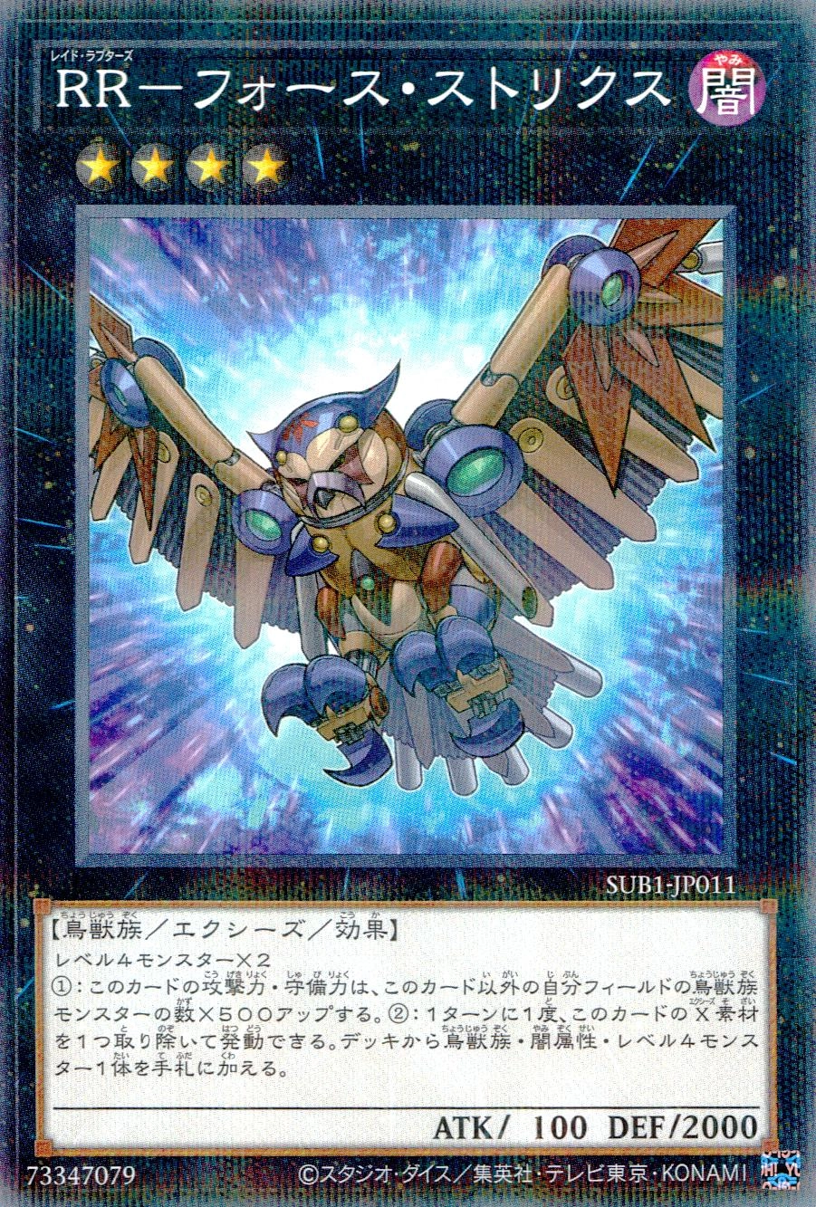 レベル4モンスター×2 ①:このカードの攻撃力・守備力は、このカード以外の自分フィールドの鳥獣族モンスターの数×500アップする。②:1ターンに1度、このカードのX素材を1つ取り除いて発動できる。デッキから鳥獣族・闇属性・レベル4モンスター1体を手札に加える。