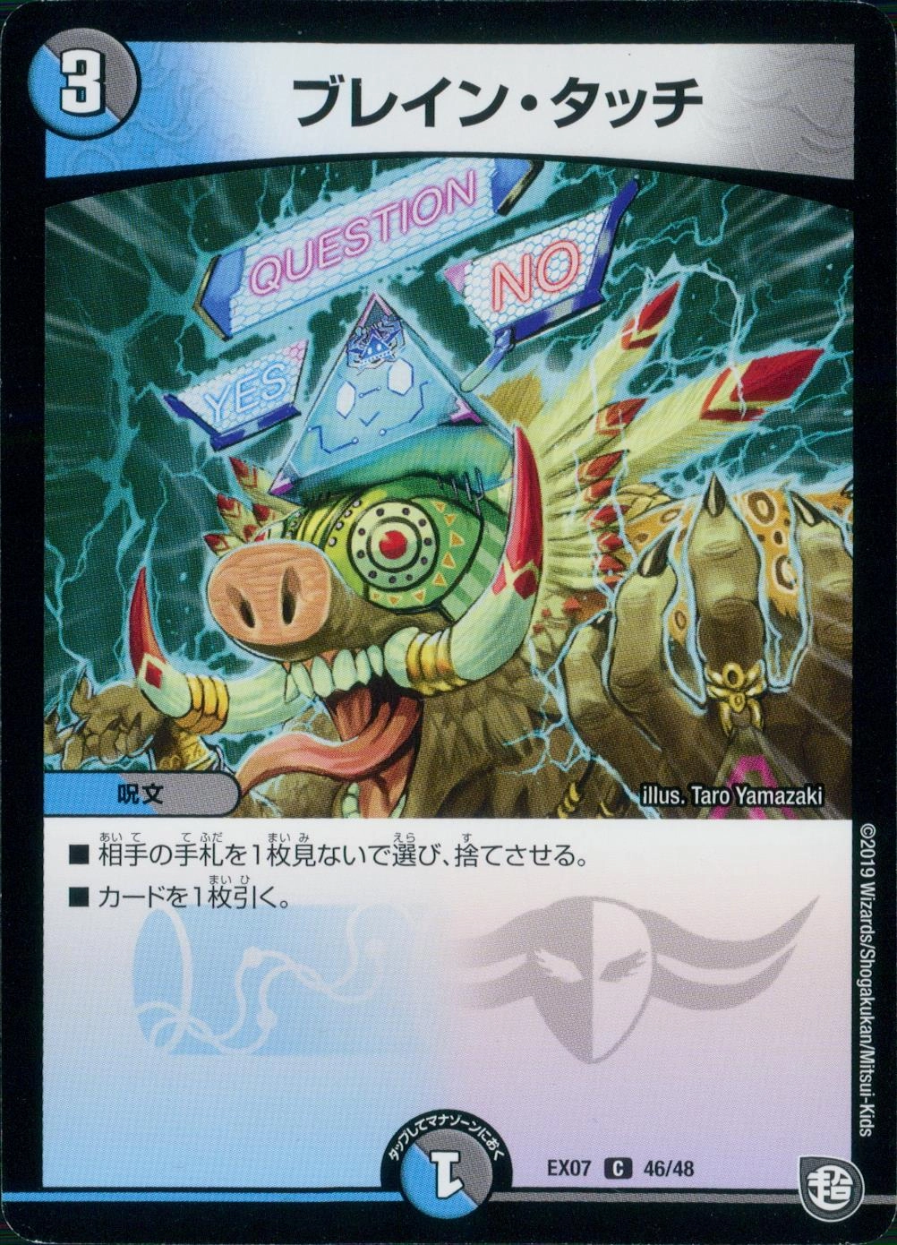 ■相手の手札を1枚見ないで選び、捨てさせる。■カードを1枚引く。