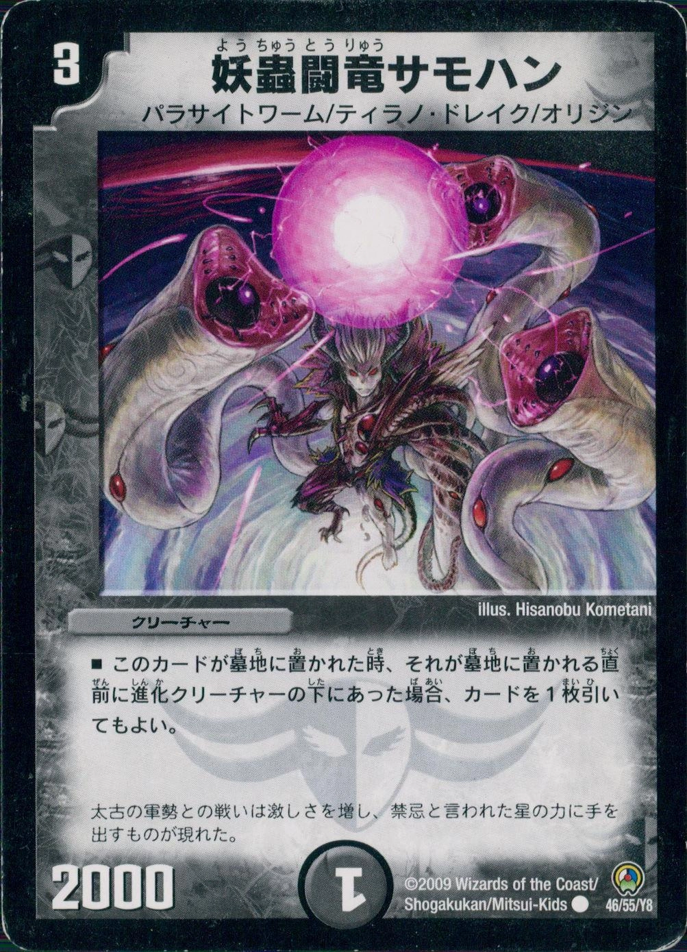 ■S・トリガー(このクリーチャーをシールドゾーンから手札に加える時、コストを支払わずにすぐ召喚してもよい)■このクリーチャーをバトルゾーンに出した時、バトルゾーンにあるすべての進化クリーチャーの一番上のカードを、持ち主のマナゾーンに置く。