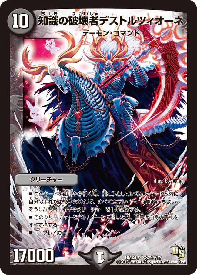 ■相手のマナゾーンにある文明1つにつき、このクリーチャーの召喚コストを2少なくする。■このクリーチャーは、出たターン、相手プレイヤーに攻撃できる。■T・ブレイカー■このクリーチャーが攻撃する時、バトルゾーンまたはマナゾーンに自分のジョーカーズが合計5枚以上あれば、バトルゾーンにある相手のカードを各文明1枚ずつ選ぶ。相手はそれらのカードを好きな順序で山札の下に置く。