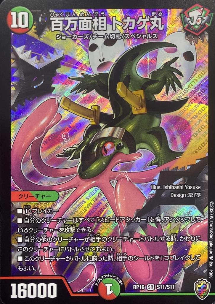 ■アビスラッシュ■ブロッカー■T・ブレイカー■このクリーチャーがタップした時、自分の山札の上から2枚を墓地に置く。その2枚のコストの合計よりコストが小さくなるように、相手のクリーチャーを2体まで選び、破壊する。