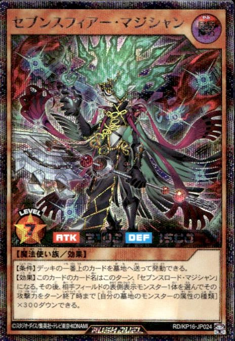 【条件】デッキの一番上のカードを墓地へ送って発動できる。【効果】このカードのカード名はこのターン、「セブンスロード・マジシャン」になる。その後、相手フィールドの表側表示モンスター1体を選んでその攻撃力をターン終了時まで[自分の墓地のモンスターの属性の種類]×300ダウンできる。