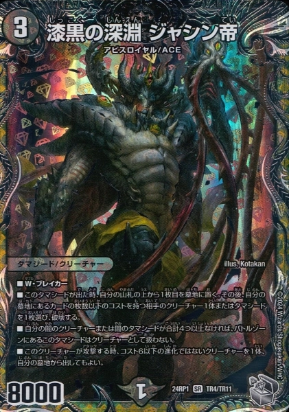 ■W・ブレイカー■このタマシードが出た時、自分の山札の上から1枚目を墓地に置く。その後、自分の墓地にあるカードの枚数以下のコストを持つ相手のクリーチャー1体またはタマシードを1枚選び、破壊する。■自分の闇のクリーチャーまたはタマシードが合計4つ以上なければ、バトルゾーンにあるこのタマシードはクリーチャーとして扱わない。■このクリーチャーが攻撃する時、コスト6以下の進化ではないクリーチャーを1体、自分の墓地から出してもよい。