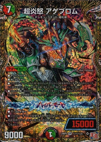 ■マッハファイター■W・ブレイカー■このクリーチャーが出た時、自分の山札の上から3枚を表向きにする。その中からコストが異なるクリーチャーを好きな数、手札に加え、残りをマナゾーンに置く。■ハイパー化:自分の他のクリーチャーを1体タップする。(自分のメインステップ中に、ハイパーモードを解放できる。ハイパーモードは次の自分のターンのはじめまで続く)~ハイパーモード~■パワー15000■T・ブレイカー■このクリーチャーが攻撃する時、自分のマナゾーンにあるクリーチャーと同じ名前を持つクリーチャーを1体、自分の手札から出してもよい。