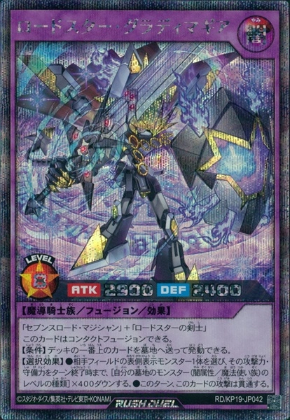 「セブンスロード・マジシャン」+「ロードスターの剣士」 このカードはコンタクトフュージョンできる。【条件】デッキの一番上のカードを墓地へ送って発動できる。【選択効果】●相手フィールドの表側表示モンスター1体を選び、その攻撃力・守備力をターン終了時まで、[自分の墓地のモンスター(闇属性/魔法使い族)のレベルの種類]×400ダウンする。●このターン、このカードの攻撃は貫通する。