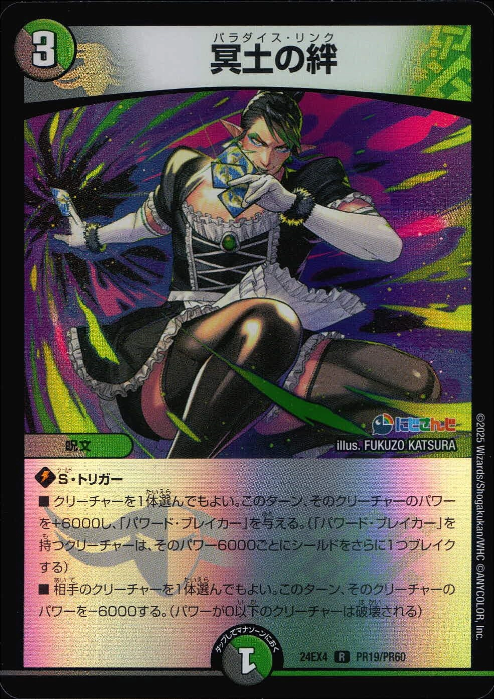 ■S・トリガー■クリーチャーを1体選んでもよい。このターン、そのクリーチャーのパワーを+6000し、「パワード・ブレイカー」を与える。(「パワード・ブレイカー」を持つクリーチャーは、そのパワー6000ごとにシールドをさらに1つブレイクする)■相手のクリーチャーを1体選んでもよい。このターン、そのクリーチャーのパワーを-6000する。(パワーが0以下のクリーチャーは破壊される)