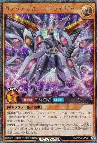 【条件】EXデッキのフュージョンモンスター(レベル9/ギャラクシー族)1体を相手に見せ、そのモンスターに素材として記されたカード名を1つ宣言して発動できる。【効果】このターン、自分が表側表示のこのカードを「フュージョン」の効果でフュージョン召喚の素材とする場合、そのカード名はこの効果で宣言したカード名になる。
