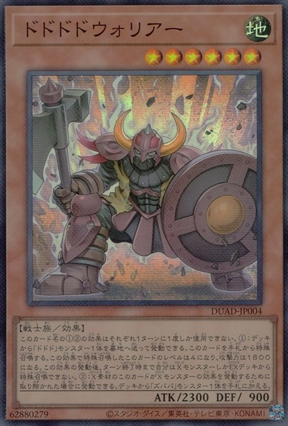 このカード名の①②の効果はそれぞれ1ターンに1度しか使用できない。①:デッキから「ドドド」モンスター1体を墓地へ送って発動できる。このカードを手札から特殊召喚する。この効果で特殊召喚したこのカードはレベル4になり、攻撃力は1800になる。この効果の発動後、ターン終了時まで自分はXモンスターしかEXデッキから特殊召喚できない。②:X素材のこのカードがXモンスターの効果を発動するために取り除かれた場合に発動できる。デッキから「ズババ」モンスター1体を手札に加える。